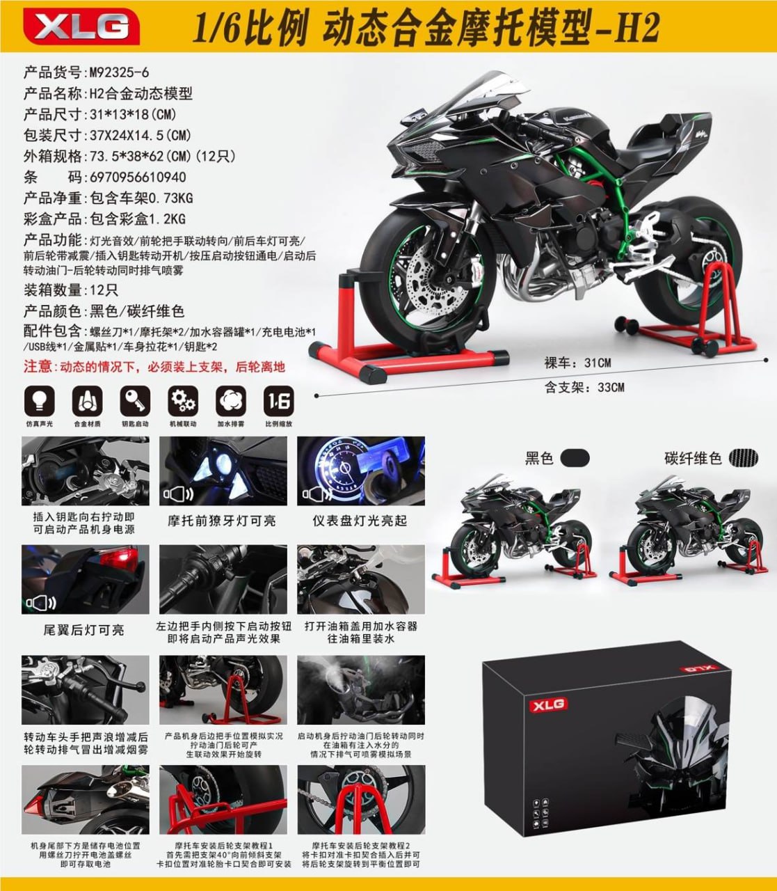 مقیاس1/6 دارای جعبه استارتی سوییچ دار گازخور چرخ چرخان همراه با گاز استند دار قابلیت ها:چراغ روشن شو /کمک فنر متحرک/کمک جلو متحرک/ جک بازشو/چرخ متحرک. بدنه:فلزی